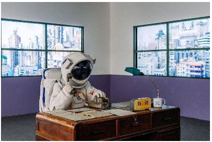 以20世纪90年代《科幻世界》编辑部为背景的“银河编辑部”,宇航员正在打电话。图为2023年“科幻世界·无限”宇宙之门超感科幻大展现场装置。
