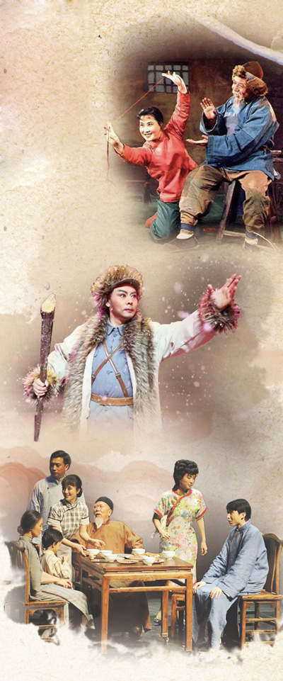 图片从上至下依次为歌剧《白毛女》(郭兰英主演)、京剧《杨靖宇》、话剧《四世同堂》剧照。