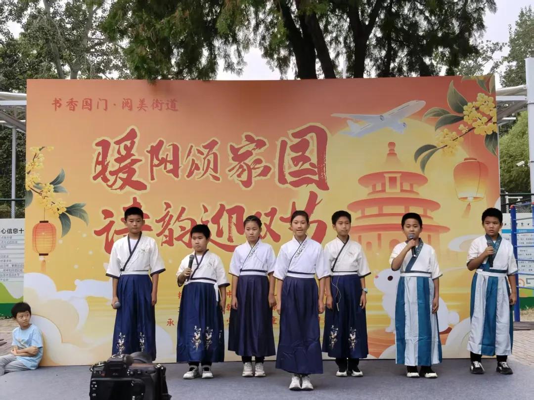 诗会环节作为整场活动的核心亮点,将氛围推向高潮。首都机场街道童声诗歌朗诵团与九十四中学的孩子们身着统一服装,以清澈纯净的童声深情朗诵《弟子规》、《诗词里的中国》、《黄河颂》等经典诗作,稚嫩的嗓音中饱含对祖国的祝福与对传统文化的热爱,打动了现场每一位观众。