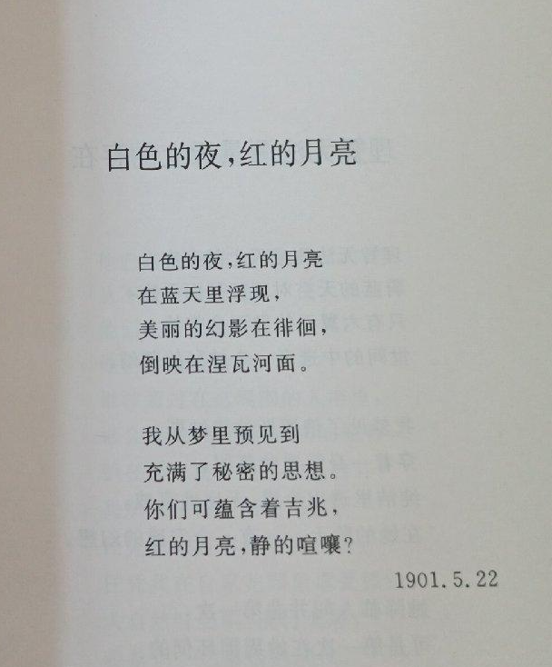 白色的夜,红的月亮/在蓝天里浮现,/美丽的幻影在徘徊,/倒映在涅瓦河面。/我从梦里预见到/充满了秘密的思想。/你们可蕴含着吉兆,/红的月亮,静的喧嚷?(《勃洛克抒情诗选》,汪剑钊 译)