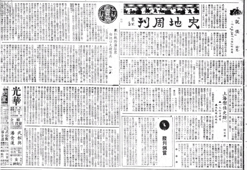 1938年1月25日,《文汇报》在孤岛上海创刊,以英商文汇有限公司名义在英国驻沪总领事馆注册,由严宝礼、胡雄飞、徐耻痕等爱国人士创办并主持。创刊不久,聘著名记者徐铸成为主笔。从创刊开始,到1939年5月被迫停刊为止,《文汇报》以宣传抗日为主旨,并因此深受读者喜爱,创刊不到半年发行量即超过5万份,成为沪上第一大报。(马光仁主编《上海新闻史(1850-1949)》,复旦大学出版社1996年版,836页)《文汇报》在利用新闻和社论鼓舞士气、反对投降的同时,也创办了许多副刊与专刊来宣传抗日,其中《文汇报·史地周刊》(以下简称《史地周刊》)创办于1939年2月22日,停刊于1939年5月17日,一共出版了13期。可能是因为存续时间不长,后来的研究者鲜少提及这份周刊。其实这份周刊是当时留沪史地学者利用历史和地理知识宣传抗日、培养民族意识的重要阵地。