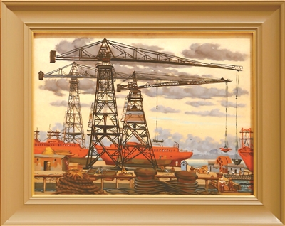 经典作品《巨臂》就是一个典型例证。这件作品依据在大连造船厂的写生资料创作。画面描绘了三台矗立于港口的起重机,它们形态相同,却因巧妙的布局在画面中各具姿态。更为精妙的是,许幸之将色彩鲜艳的橙色大船置于起重机之后,并未展现全貌。常人或许不会以如此平视的角度刻画这三台起重机,更不会想到将大船作为背景。而许幸之巧妙的构图视角,正是其创作的独具匠心之处。