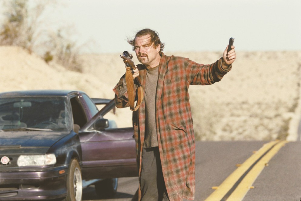 迪卡普里奥的表演,是影片的一个突出亮点。他放弃了所有帅气、潇洒的姿态,将一个中年男人的臃肿、邋遢、疲惫和无力演绎得颇为到位。他眼神浑浊,步伐蹒跚,T恤上沾着食物污渍,头发油腻不堪。这不仅是造型上的“祛魅”,更是表演重心的转移。迪卡普里奥在片中大量运用了迟钝、笨拙的肢体语言:他不再是《华尔街之狼》中那个充满蛊惑力的演说家,而是一个在沙发上昏睡、在威胁面前第一反应是退缩的“失败者”。他通过对这种“反高潮”的身体状态的精准控制,塑造了一个被生活重压磨平了棱角的普通人。