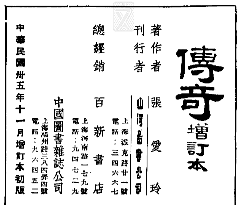 11月,《传奇》增订本出版之后,《新闻报》1946年12月2日、1947年1月30日,《大公报》1947年1月31日、5月6日都登了广告。山河图书公司1947年出版的三期《大家》杂志上,也都登了这部书的广告,前两期还是整页广告。由于当时物价一路上涨,书价从1946年底初出版时的4500元一路上涨到了1947年上半年的9000元,到了五六月间,书价涨到了12000元。山河图书公司在1946-1947年存续期间只做过三种广告:旗下的两种刊物《清明》《大家》以及张爱玲的《传奇》增订本。