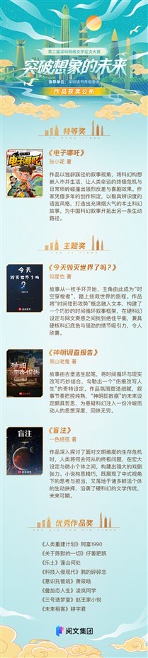 本届征文大赛以“突破想象的未来”为主题,聚焦科幻IP孵化,挖掘精品网文故事,下设“未来人类生活”“新技术下的新冒险”“自由意志的新生命”三大方向,共征集参赛作品两万余部。其中,《电子哪吒》获特等奖,《今天毁灭世界了吗?》《神明调查报告》《盲注》获主题奖,《人类重建计划》等8部作品获得优秀作品奖。