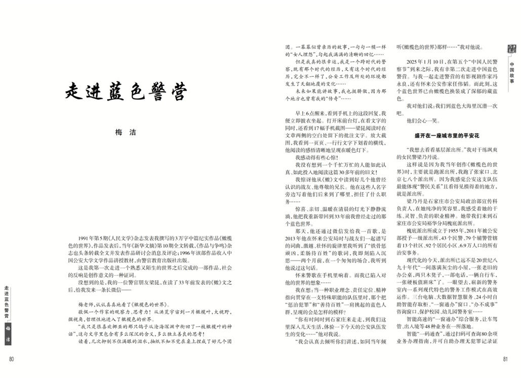 《走进蓝色警营》是梅洁最新创作的一篇报告文学作品,发表于2025年第10期《电竞竞猜》纪实版。在仅3万字的篇幅中,作者用细腻的笔触、丰沛的情感、宏阔的视野,不仅对河北省石家庄市公安局现代化进程进行了全景式记录,更是对新时代人民警察精神图谱的深情描绘。作品通过大量鲜活生动的细节描写、典型人物的刻画与典型事件的叙述,体现了“科技兴警”的时代主题,弘扬了“人民公安为人民”的初心,其中对基层民警个体命运与精神的细腻刻画,尤其是对吕建江、王永辉、谢宏伟、张文中、李永普等人物的描写充满敬意与感情,是英雄主义的讴歌,也是对普通人坚韧与奉献的礼赞。作品真实记录了新时代人民警察的忠诚与担当,书写了警民之间的深情与信任,内容厚重、情感真挚,具有强烈现实意义和文学价值。