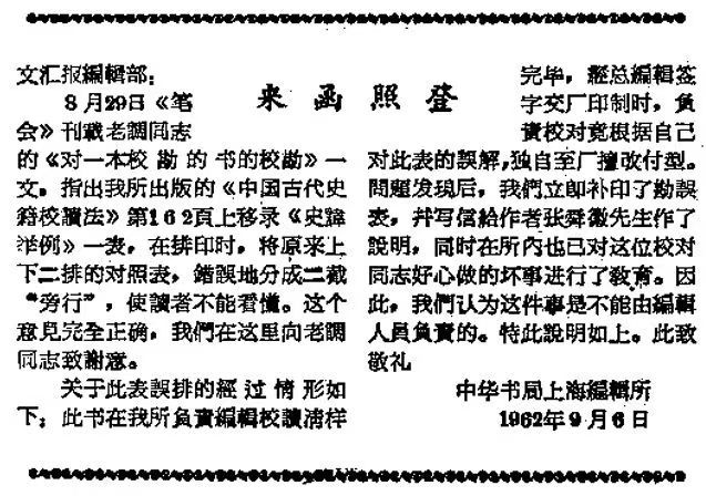 接下来想说说一桩旧事,虽则与上文说的“错字”故事关系不大,但也属于“误书误刻”一类。上海《文汇报》1962年8月29日第四版“笔会”曾登过一篇《对一本讲校勘的书的校勘》,署名“老调”,文章指出了中华书局上海编辑所1962年7月出版的张舜徽《中国古代史籍校读法》一书,第162页至163页讲史籍避讳一章时,引用了陈垣《史讳举例》的一处表格,原本应是上下两栏一一对应的关系,表明同一人在不同史籍中因避讳而造成的不同称呼。这张表排版竟完全错乱,看不出上下对应的关系。似是将原稿的上下对应,理解为“旁行”(即古籍中有横着两行或数行排列的地方,不是竖读,而是从右往左横读,一行读完,再读下一行)关系,又按版面重排,竟致表的意义完全不能理解。中华书局上海编辑所则在1962年9月11日“笔会”的“来函照登”栏目进行了回应: