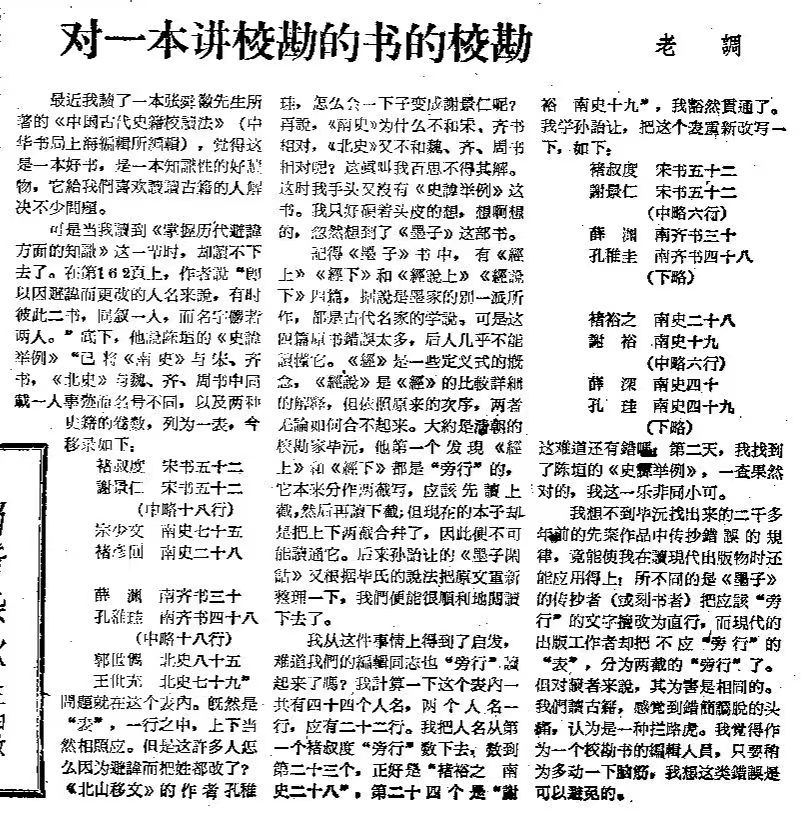 今天《文汇报》有《中国古代史籍校读法》的批评,查此书由我担任通读,当时对此表并未读过,认为已校过多次,一般的读不易发现问题,为求急于出书,便未细读,否则四十四人同姓不同名的上下相对,当不难理解,却只看到此表上排多有“宋书”,下排多有“南史”字样,也当作旁行。盖因此书38页的表,提到旁行与直行的错误,又有152页的表,作者也误作直行,(其他类似的更多)便突然加以校改,却把上文“彼此二书,同叙一人”的一段话疏忽了,实为主因。
