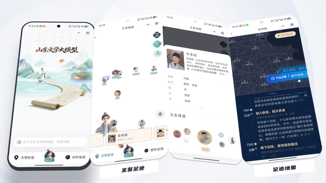 山东文学大模型依托齐鲁文化大模型的强大技术底座,以丰富的山东文化数据库为核心训练语料,汇聚了齐鲁大地源远流长的文学瑰宝。其中,“文学地标”复刻故居书院,虚拟地图一键抵达;智能数字人“AI小文”身居C位,智能互动在线问答,与你畅享齐鲁文思,千问千解皆有回响;“圣贤足迹”带你穿越数字时空,与辛弃疾共酌、同蒲松龄话异;“VR文学馆”1:1复刻山东文学馆,带你沉浸式逛馆,阅尽文学史诗;“创作空间”方便每位文学爱好者随时随地上传文字作品,提笔续传齐鲁文脉。山东文学大模型致力于技术驱动山东文学实现数字化蝶变、智能化新生,为用户打造一个无界的文学殿堂。
