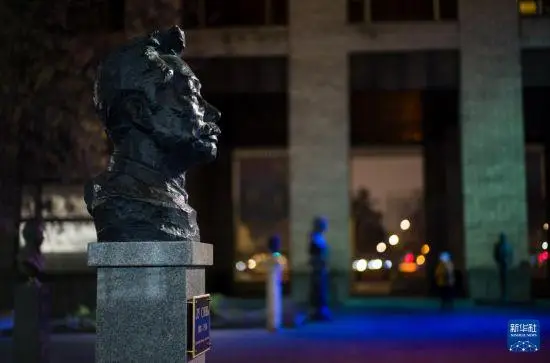 这是12月5日在俄罗斯首都莫斯科全俄外国文学国家图书馆拍摄的鲁迅铜像。新华社记者 孟菁 摄