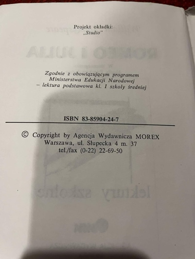 (注:舞台上所使用剧本的封底、版权页和封面。封底的价签上标记着“44000”,版权页标注:“根据波兰国民教育部现行教学大纲——中等学校一年级的必读文学作品”。)