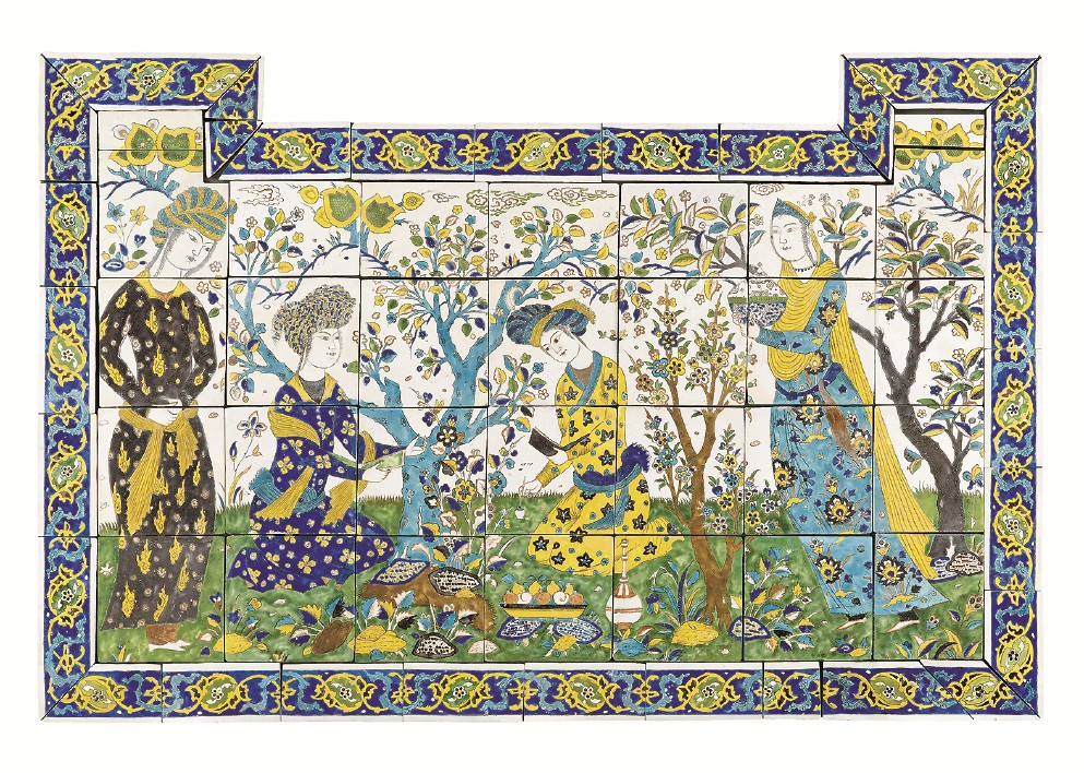 在伊朗萨法维王朝的宫廷中,绘画、建筑与诗歌被视为三位一体的审美系统。画师们往往同时是诗人,以极为精致的工笔绘制宫廷生活、爱情故事、神话场景,搭配波斯文学诗句。伊朗细密画中,人物衣袍图案与背景的地毯纹样常常构成一个和谐宇宙,几何与花卉,层叠交融,如梦如幻。如本次展览中有一件著名的诗会图釉面陶板,由数十块拼瓷组成,描绘的是两位王子在花园中举办诗会的场景。这种文艺情境的表达方式,显示出图案艺术如何从建筑和器物延展为精神空间。此外,书籍装帧也体现出这种风格,展品中有一件“夜莺与玫瑰”图案的书籍装饰,借物抒情以传达诗性的浪漫叙事。