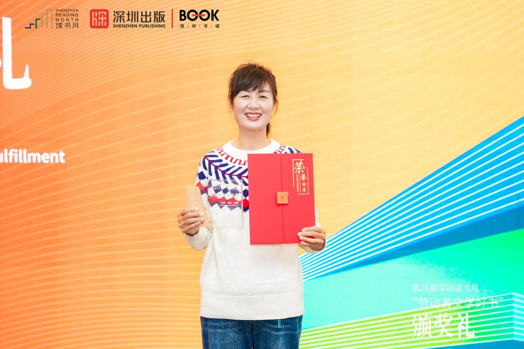 李文丽在第二十六届深圳读书月“劳动者文学好书”领奖台上