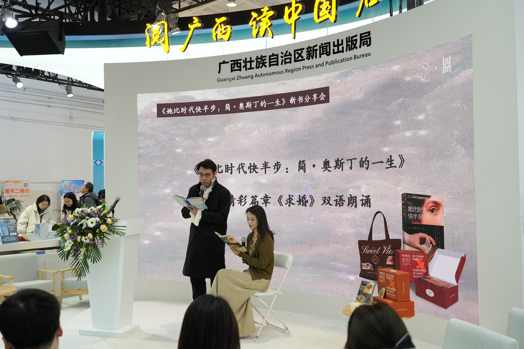 活动尾声,来自北京新知了出版咨询有限公司的两位工作人员以中英双语形式,深情朗诵了本书精彩章节《求婚》,用优美的语言再现简?奥斯丁笔下的情感张力与文字魅力,为本次分享会画上圆满句号。