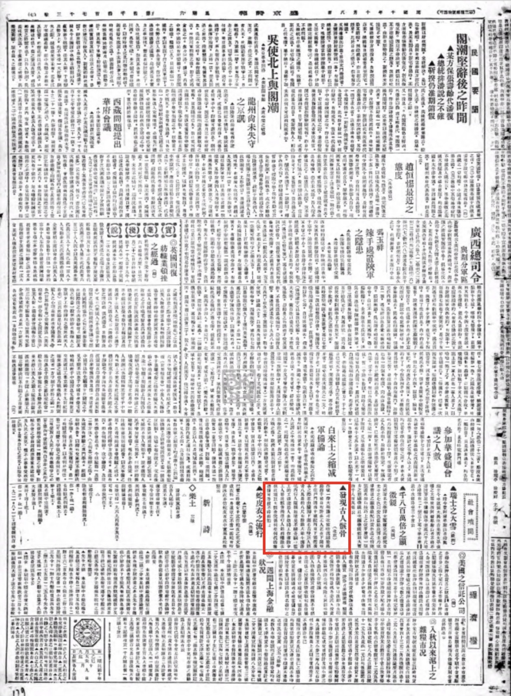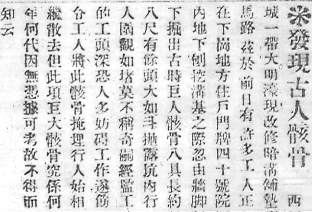 能和《用妓女做美人局——冤大头的新闻》《筹设屠宰场务》《祝融敖广决胜负——毕竟是龙王的法力大》这类新闻放在一起,这则《发现古人骸骨》报道是否如吕思勉先生所认为的“众目昭彰,不容虚构”,“长约八尺有余,头大如斗”的细节是否确切,要打上一个大大的问号。