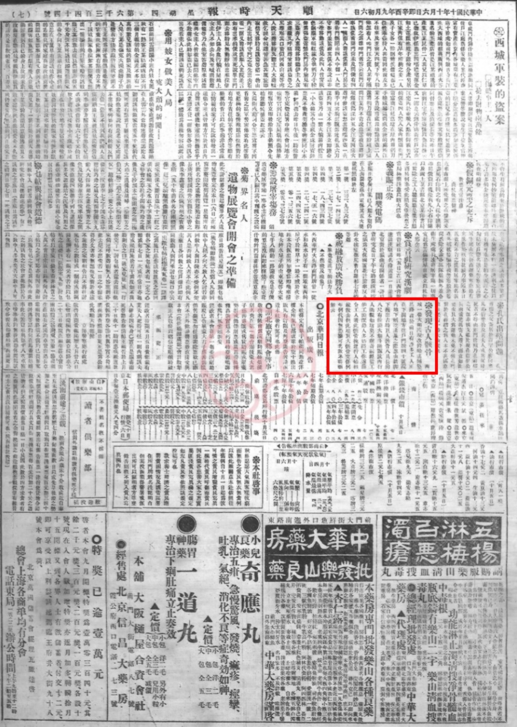 1921年10月6日的《顺天时报》第七版报道了大明濠挖出巨人骸骨,下图就是这一版面及该报道的放大图: